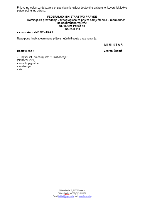 Prijave na oglas sa dokazima o ispunjavanju uvjeta dostaviti u zatvorenoj koverti isključivo putem pošte, na adresu: