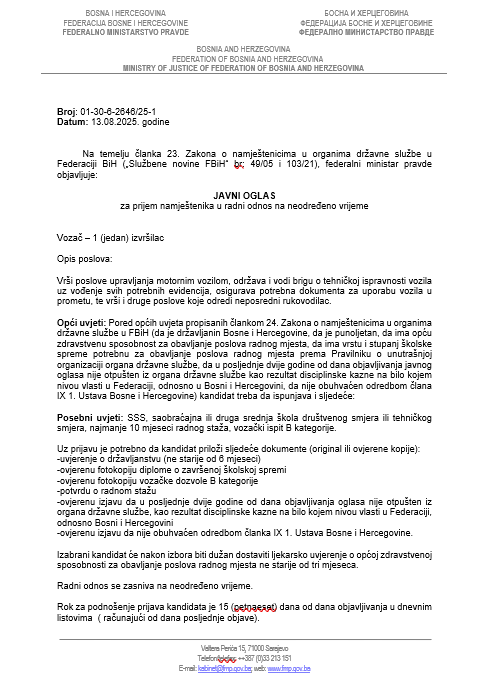 Opći uvjeti: Pored općih uvjeta propisanih člankom 24. Zakona o namještenicima u organima državne službe u FBiH (da je državljanin Bosne i Hercegovine, da je punoljetan, da ima opću zdravstvenu sposobnost za obavljanje poslova radnog mjesta, da ima vrstu i stupanj školske spreme potrebnu za obavljanje poslova radnog mjesta prema Pravilniku o unutrašnjoj organizaciji organa državne službe, da u posljednje dvije godine od dana objavljivanja javnog oglasa nije otpušten iz organa državne službe kao rezultat disciplinske kazne na bilo kojem nivou vlasti u Federaciji, odnosno u Bosni i Hercegovini, da nije obuhvaćen odredbom člana IX 1. Ustava Bosne i Hercegovine) kandidat treba da ispunjava i sljedeće: