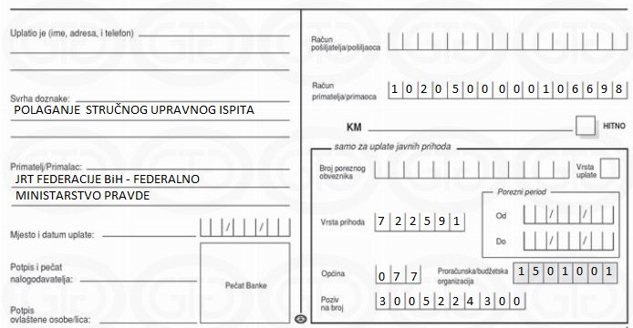 Uplata se vrši nakon što kandidat primi obavijest o terminu polaganja ispita, a dokaz o uplati se predaje tajniku Povjerenstva neposredno prije pristupanja pismenom dijelu ispita.
